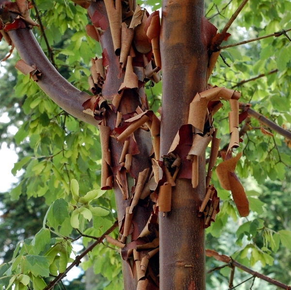 Les érables du genre acer présente de nombreuses espèces dont certaine possèdent une écorce remarquables. Certains sont appelés érables à peaux de serpent de par leur zébrures au couleurs fortement marquées. D’autres écorces desquament fortement à la manière du bouleaux.