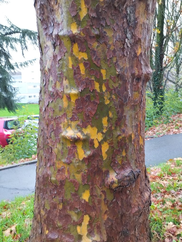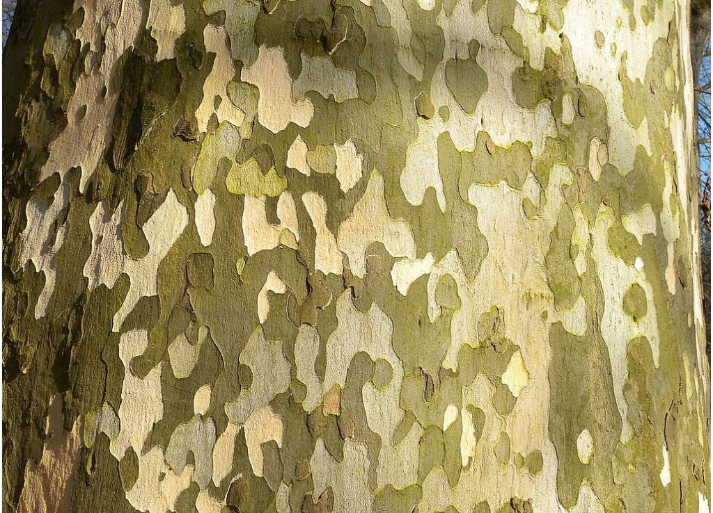 Les platanes sont connus pour leur écorce particulièrement colorée. L’écorce se décolle par petites plaques qui forment des taches de couleurs variées selon les espèces.
